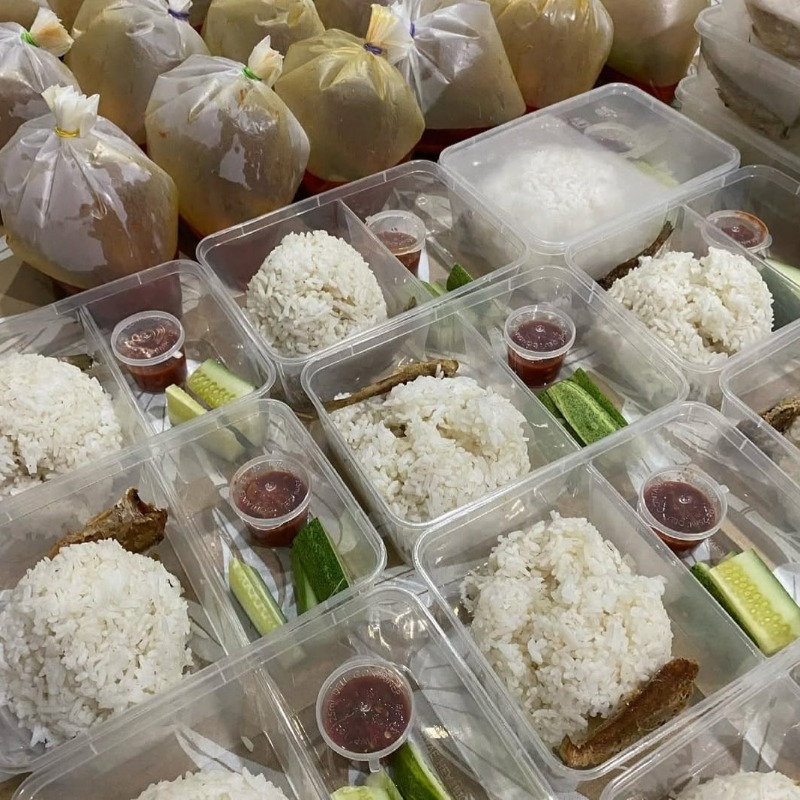 Set nasi dibungkus dalam bekas lunch box dan lauk dibungkus rapi.