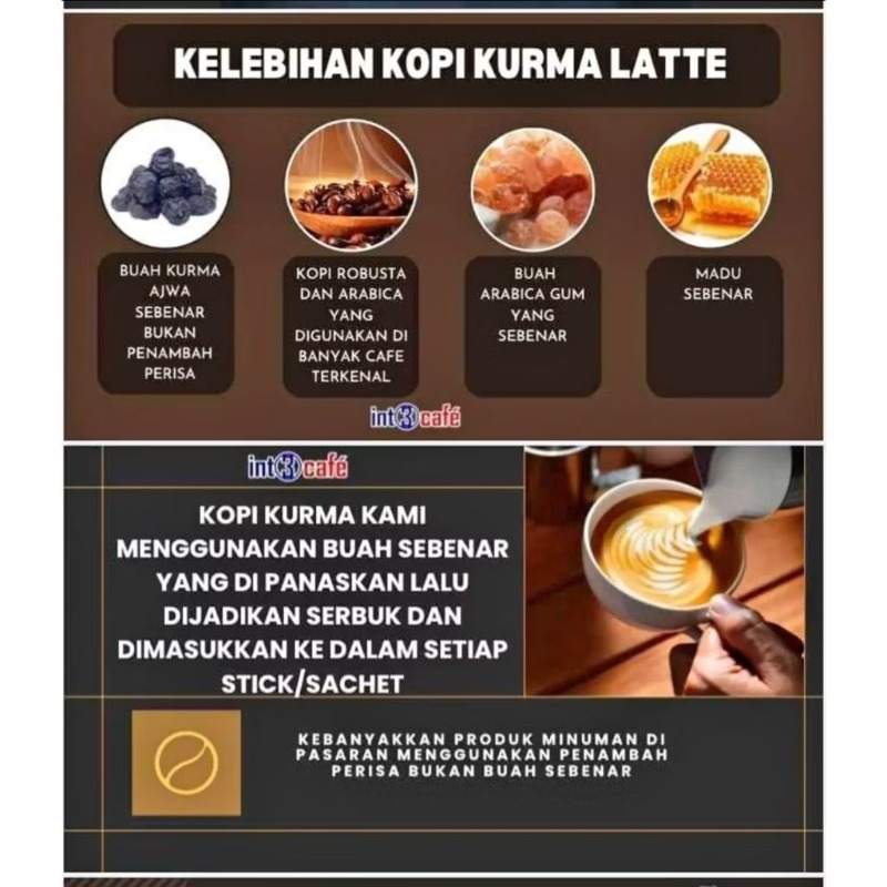 Moh semua peminat kopi latte, pekene secawan pasti nak lagi. keunikan AROMA kopi yang segar RASA kopi dengan campuran 3 bahan asli GAM ARAB, KURMA dan MADU menjadikan KOPI LATTE ni tersangat lah sedap.