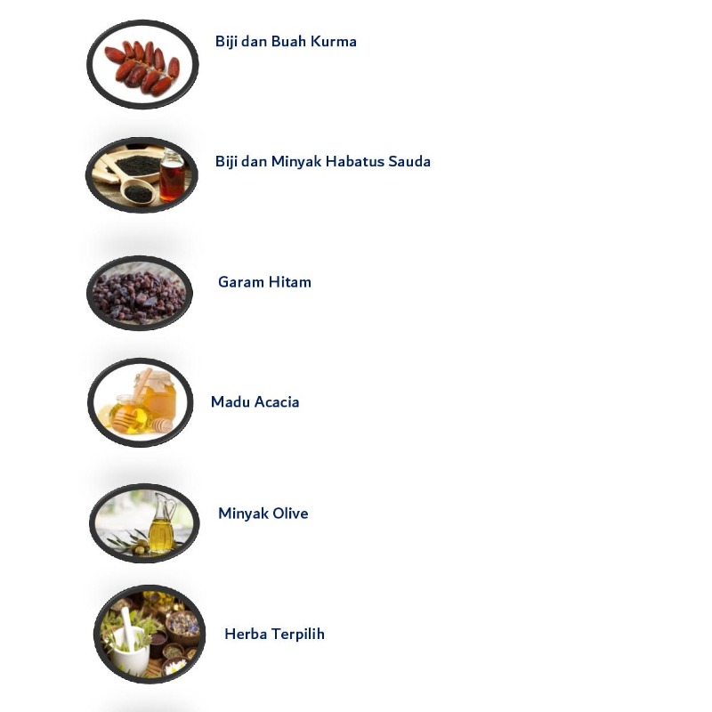 Diperbuat daripada Kurma, Habatus Sauda, Minyak Olive, Madu Akasia, Garam Bukit, Herba Terpilih.