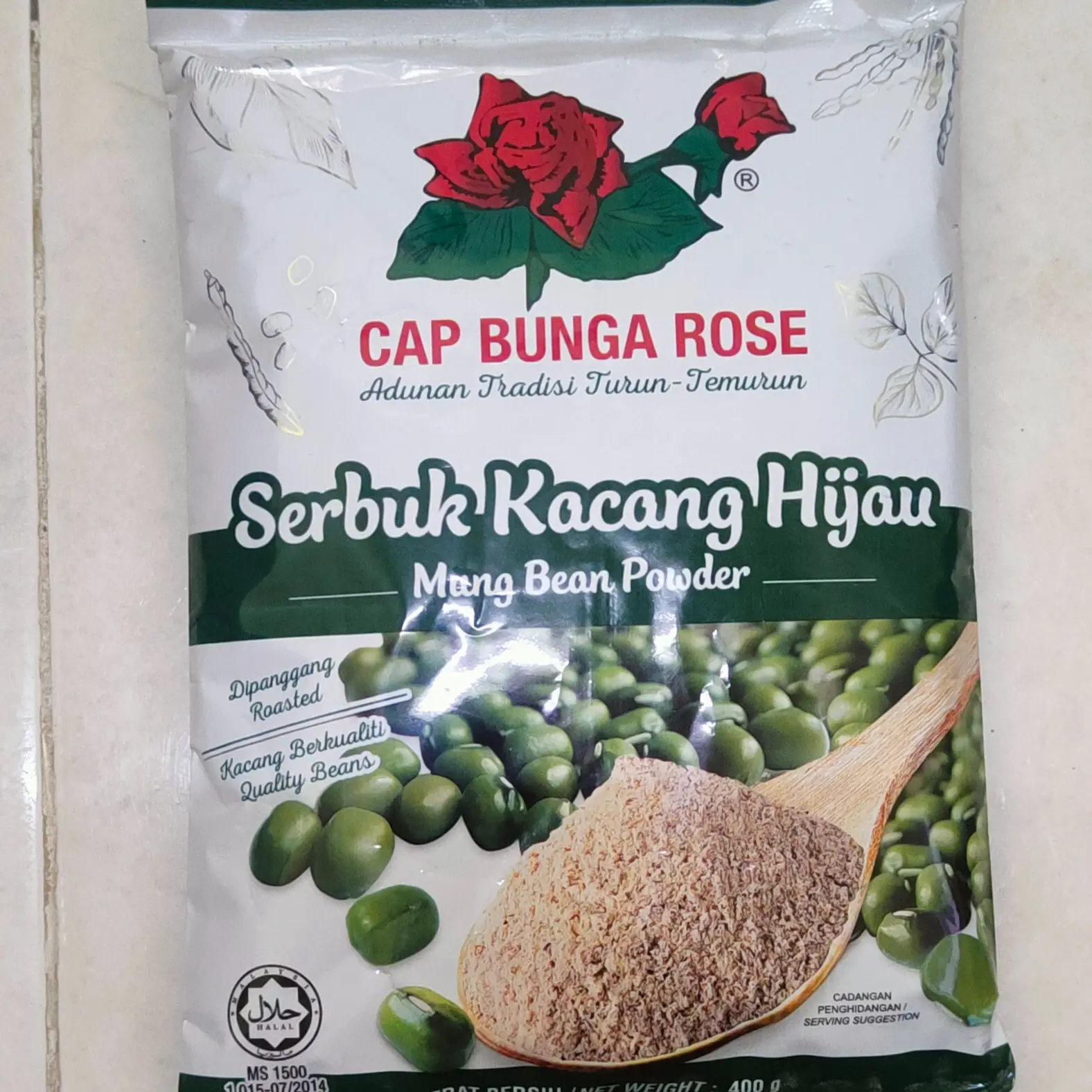 Serbuk Kacang Hijau - Cap Bunga Rose 400g. Ia adalah produk yang dikenali sebagai serbuk kacang hijau dengan cap bunga rose. Sangat sesuai digunakan untuk membuat aneka kuih seperti Koleh Kacang Putu Kua, Batang Buruk, Menganang, Akok Kacang atau untuk dicampur ke dalam ramuan bubur Asyura.